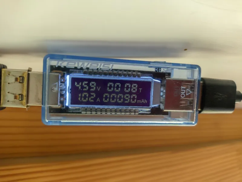 Закрепил солнечную панель под углом на глаз. Сейчас в Поволжье стоят солнечные дни, жарко, и максимум что я засек на экране тестера это 4,7 вата из 10 ват обещанный производителем. Возможно угол наклона панели неидеальный, возможно из-за жары (температура поверхности панели в обед доходит до 67 градусов). Но панель все равно порадовала тем, что за полдня (во второй половине дня солнце заходит за дом и панель в тени) мои павербанки набирают 6000-7000mAh. Павербанки я соединил как на фото: от солнечной панели кабель заходит в верхний павербанк (дешёвый самосборный) который может пробрасывать энергию в нижний павербанк, при этом сам заряжаясь. Получается что заряжаются оба. Нижний павербанк Xiaomi на 10000mAh, он кстати без проброса энергии, т.е. он может либо сам заряжаться либо заряжать кого нибудь, одновременно не может, потому я его и включил в цепочку вторым.