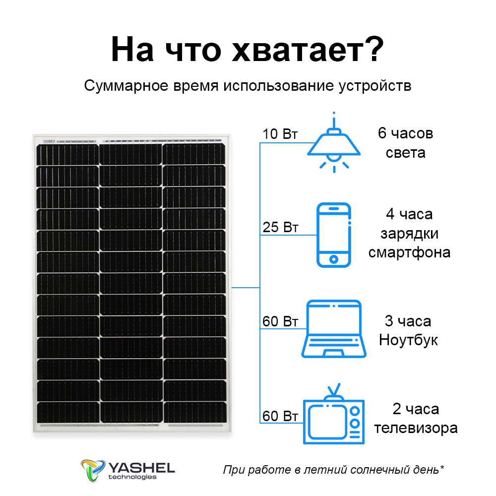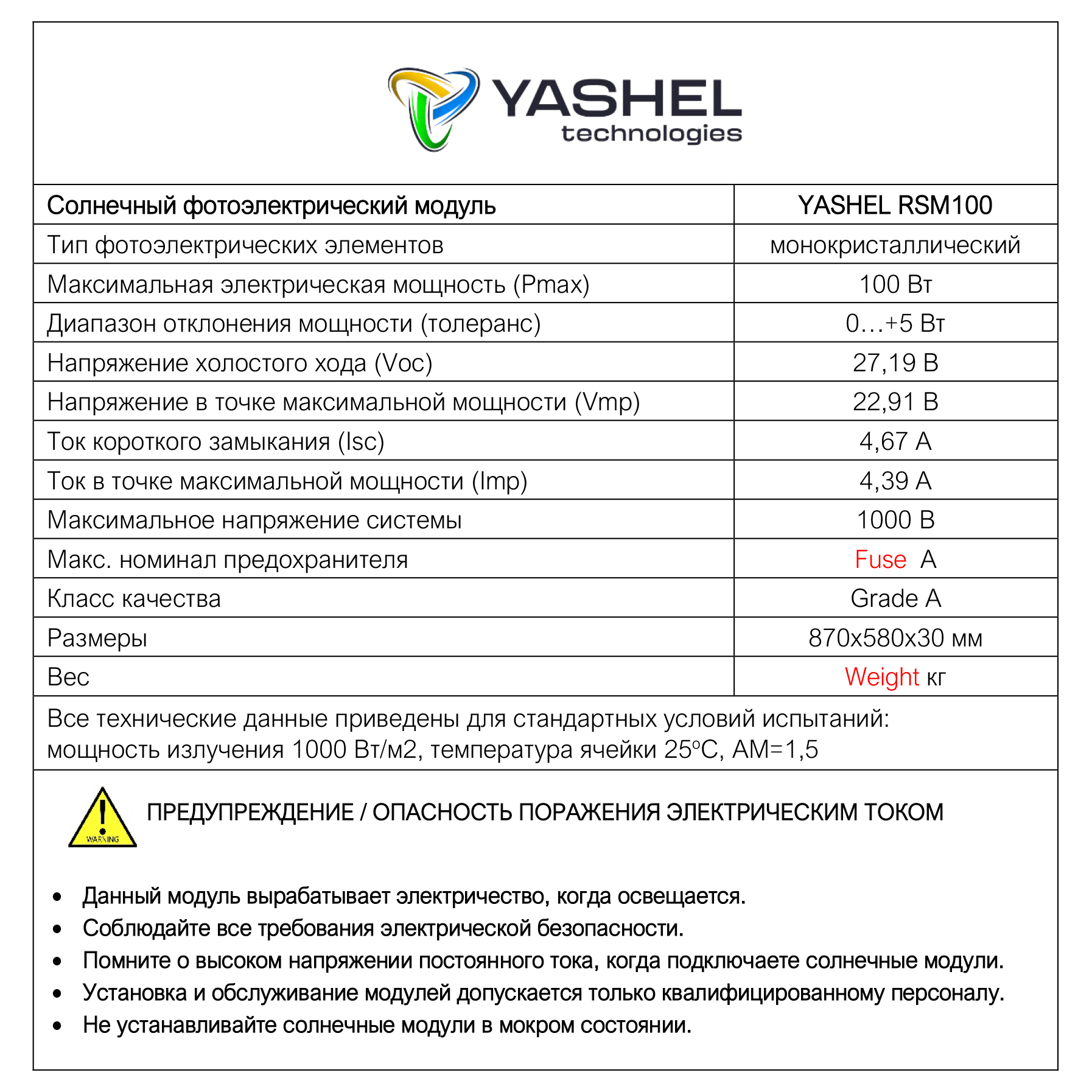 - Солнечная панель Yashel YSM 100Вт Монокристалл;