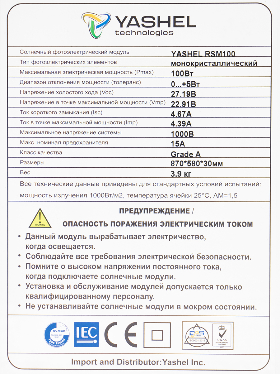 Солнечные панели YASHEL имеют срок службы более 30 лет. Гарантия 1 год - панели не будут иметь дефектов конструкции, материала, изготовления, которые существенно препятствуют их функционированию, и будет соответствовать спецификациям и чертежам, применимым к ним. Кроме того, гарантируется, что в течение тридцати лет снижение выходной мощность не будет превышать указанную номинальную выходную мощность (STC):