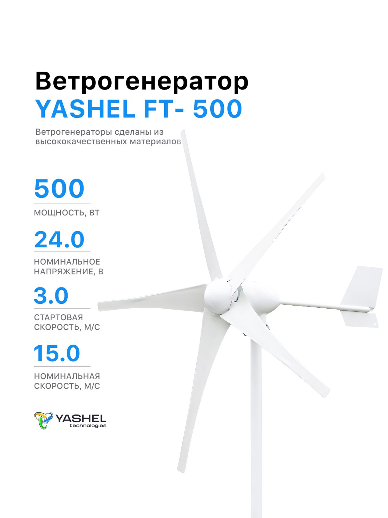 • Ветрогенератор 500Вт дает выработку экологически чистой и бесплатной электроэнергии как минимум 10-15 лет.